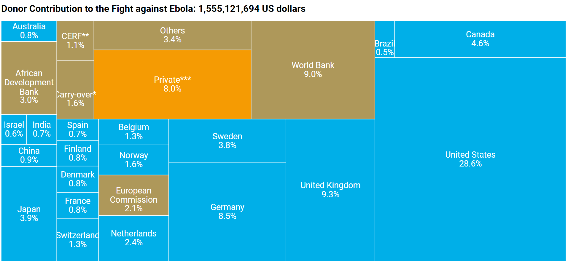 La financiación requerida, que en abril de 2014 se había estimado en 15 millones, creció a 1.500 millones en diciembre de 2014 (según estimaciones de OCHA). Para enero de 2015 los diferentes donantes (gobiernos, organizaciones multilaterales, ONG, sector privado) habían prometido la cifra prodigiosa de 3.500 millones de dólares, aunque en julio de 2015 más de 600 millones seguían sin pagarse.