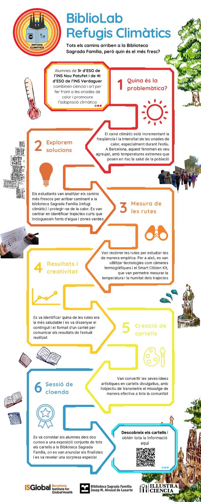 El proyecto está formado por talleres de arte y ciencia. En una primera parte, se llevaron a cabo sesiones de ciencia ciudadana, donde se transmitió la evidencia científica sobre las oleadas de calor, se analizaron los trayectos para llegar andando a la biblioteca y se midieron factores ambientales, como la temperatura y la humedad, para determinar lo más saludable. Tras analizar los datos, se presentaron los resultados obtenidos y se desarrolló la segunda parte de talleres de arte y manualidades. Los participantes planificaron y diseñaron carteles para comunicar y promover el uso de los trayectos más convenientes con los usuarios de la biblioteca como refugio climático, vecinos del barrio de la Sagrada Família y/o ciudadanía de Barcelona.