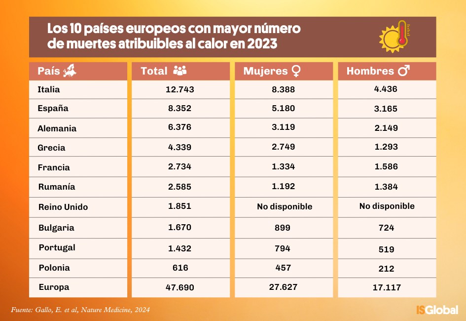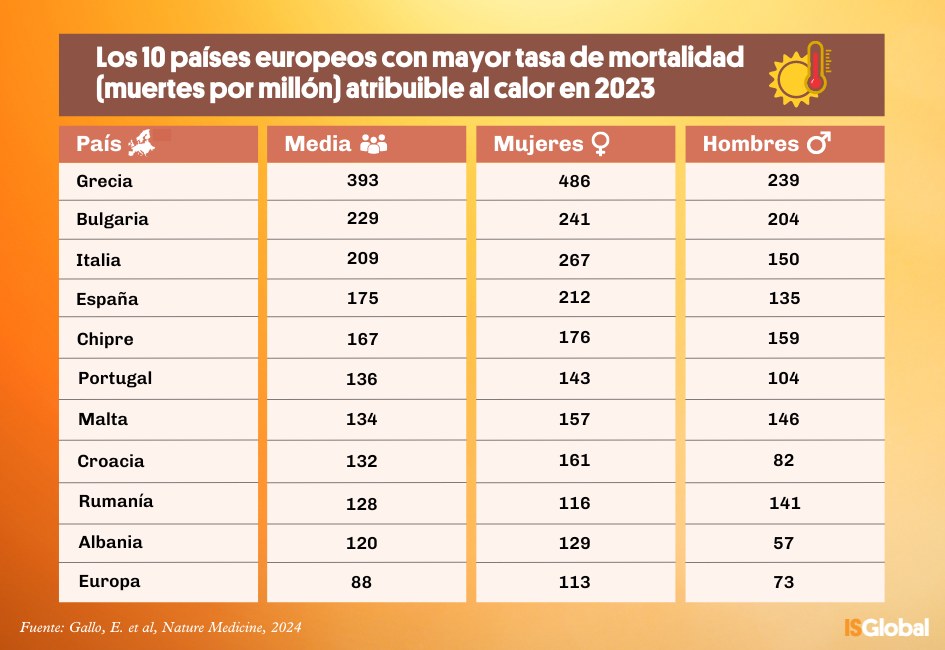 Los resultados muestran un total de 47.690 muertes estimadas en 2023 en el conjunto de los 35 países, de las cuales 47.312 se habrían producido en el periodo más caluroso del año (entre el 29 de mayo y el 1 de octubre). Si se tiene en cuenta la población, los países con mayores tasas de mortalidad relacionada con el calor se encontraban en el sur de Europa, concretamente Grecia (393 muertes por millón), Bulgaria (229 muertes por millón), Italia (209 muertes por millón), España (175 muertes por millón), Chipre (167 muertes por millón) y Portugal (136 muertes por millón).