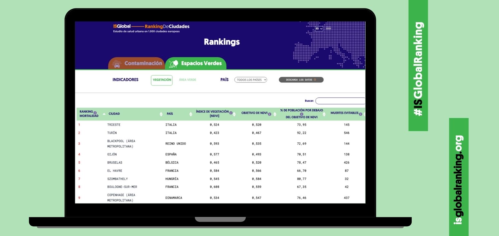 En base a la evidencia científica existente, la OMS recomienda el acceso universal a los espacios verdes y establece la meta de que haya un espacio verde de al menos media hectárea a una distancia de no más de 300 metros en línea recta desde cada domicilio. Partiendo de este objetivo y de los datos proporcionados por estudios anteriores, un equipo de la Iniciativa de Planificación Urbana, Medio Ambiente y Salud de ISGlobal ha estimado la mortalidad atribuible a la falta de espacios verdes en 978 ciudades y 49 áreas metropolitanas.