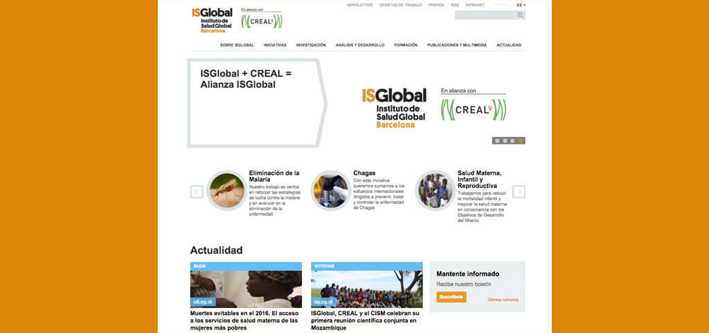 El proceso de fusión entre el Instituto de Salud Global de Barcelona (ISGlobal) y el Centro de Investigación en Epidemiología Ambiental (CREAL) afronta en el primer semestre de 2016 su recta final. Una parte fundamental de la integración entre ambas instituciones es la unificación de sus canales de comunicación respectivos y, en particular, de sus webs. El primer paso en esta dirección se ha dado el 1 de marzo de 2016, fecha a partir de la cual las noticias y actividades de ambas instituciones pasarán a publicarse de manera íntegra solo en www.isglobal.org, mientras que en la página www.creal.cat, que seguirá activa, se publicará únicamente los resúmenes y enlaces a las mismas.