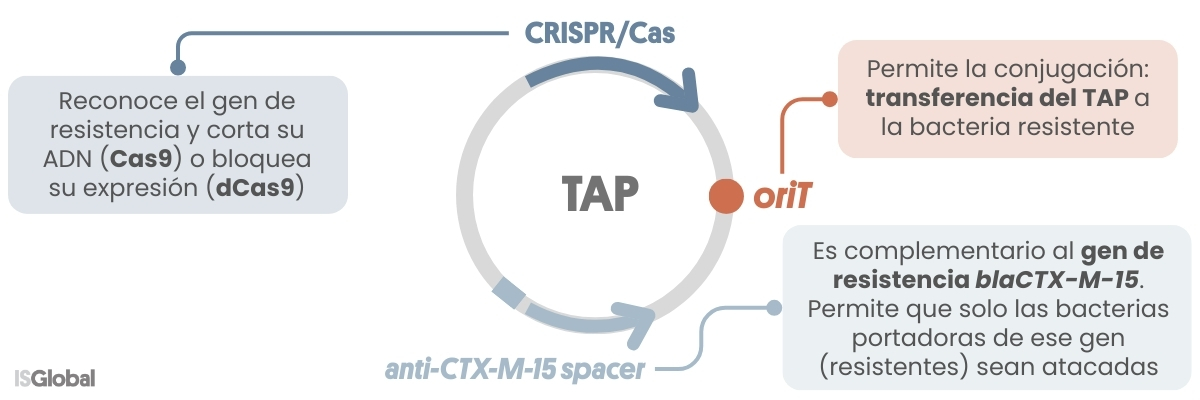 Para ello, utilizan la conjugación bacteriana, un mecanismo natural de transferencia de ADN, para introducirse en la bacteria resistente. Una vez dentro, los TAP expresan un sistema CRISPR-Cas programado para identificar una secuencia concreta de ADN bacteriano y provocar la muerte de la bacteria resistente o hacer que pierda la resistencia al antibiótico.