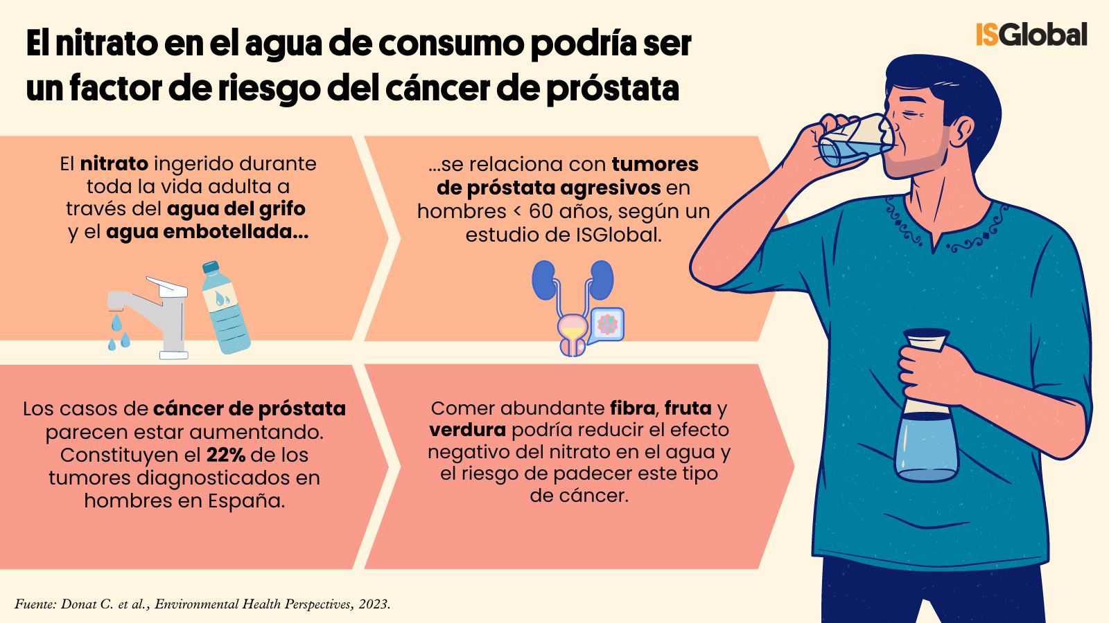 “Se ha sugerido que los cánceres de próstata agresivos y, por tanto, de peor pronóstico, tienen causas etiológicas subyacentes diferentes a los tumores de crecimiento lento con un curso indolente, y nuestros hallazgos confirman esta posibilidad” explica Carolina Donat-Vargas, investigadora de ISGlobal y primera autora del estudio. La investigadora también resalta que "los riesgos asociados a la ingesta de nitrato a través del agua ya se observan a consumos de agua con niveles por debajo de los máximos permitidos por las directivas europeas, 50 mg de nitrato por litro de agua”.