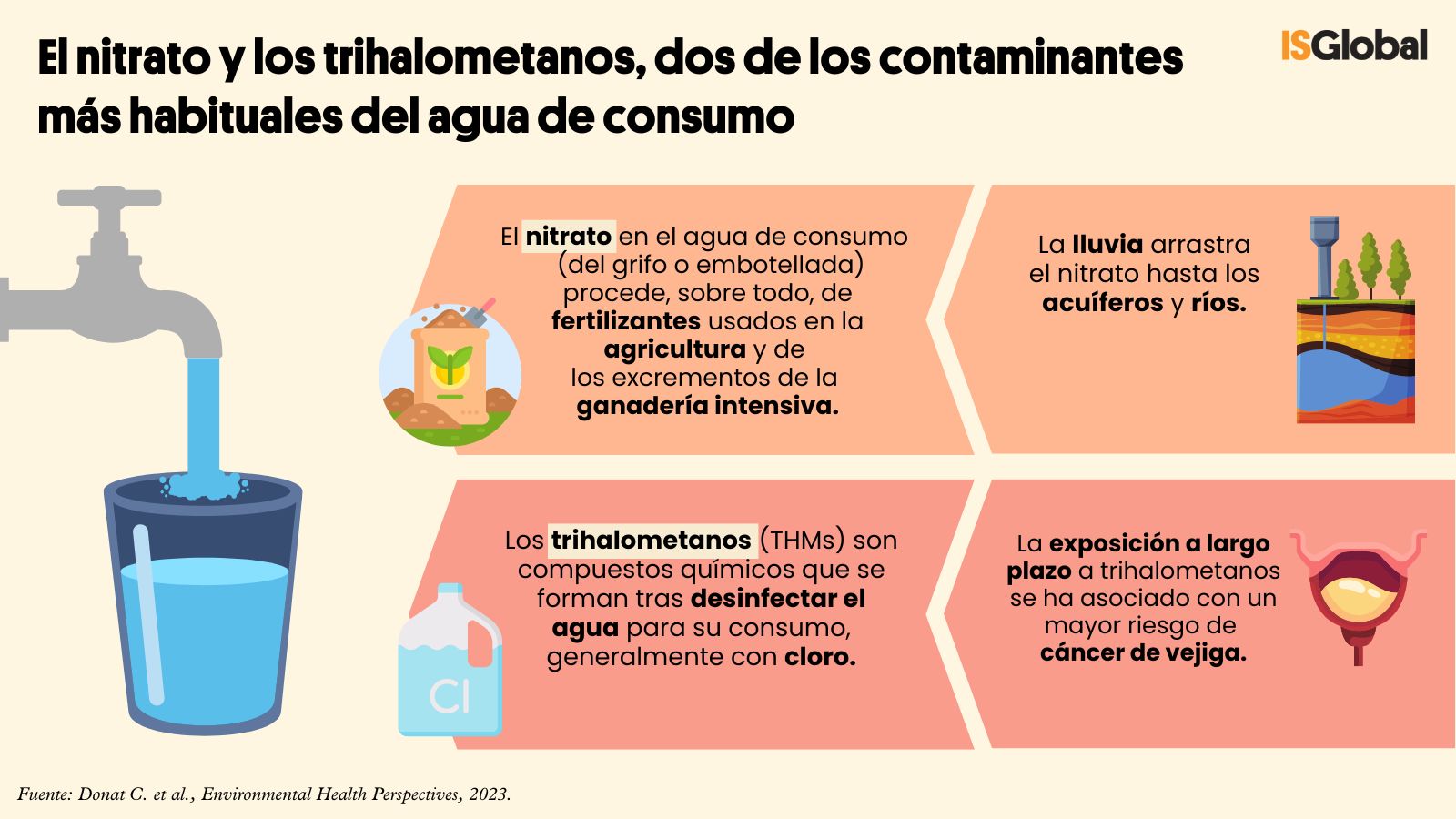 El objetivo del estudio era evaluar si existía una relación entre la ingesta de nitrato y trihalometanos (THMs) a través del agua de consumo y el cáncer de próstata. Tanto el nitrato como los THMs son dos de los contaminantes más habituales del agua de consumo. El nitrato presente en el agua procede de los fertilizantes y excrementos de la agricultura y ganadería intensivas. La lluvia lo arrastra hasta los acuíferos y ríos. “Es un compuesto que forma parte de la naturaleza, pero hemos alterado su ciclo natural”, explica Cristina Villanueva, investigadora de ISGlobal especializada en contaminación del agua. Ahora se estudia si una exposición al nitrato sostenida a lo largo de la vida adulta podría llegar a desencadenar un cáncer.