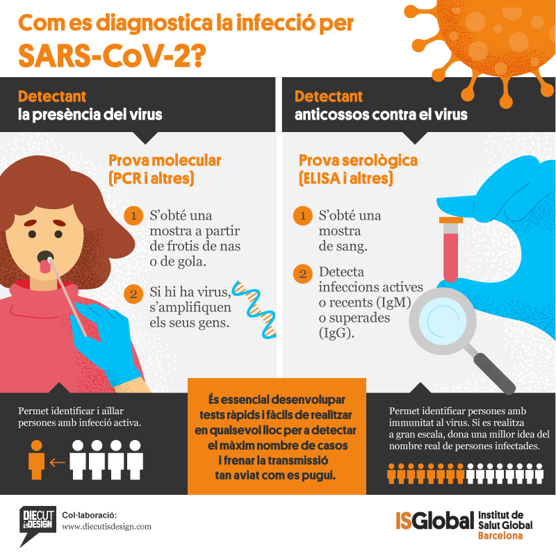 Existeixen dos tipus de proves per a diagnosticar la COVID-19: les moleculars, basades en la detecció de virus en mostres obtingudes mitjançant frotis de nas o de gola, i les serològiques, que detecten anticossos en sang. El desenvolupament de test ràpids i fàcils de realitzar a qualsevol lloc és essencial per a diagnosticar el màxim nombre de casos i ajudar així a frenar la transmissió al més aviat possible.