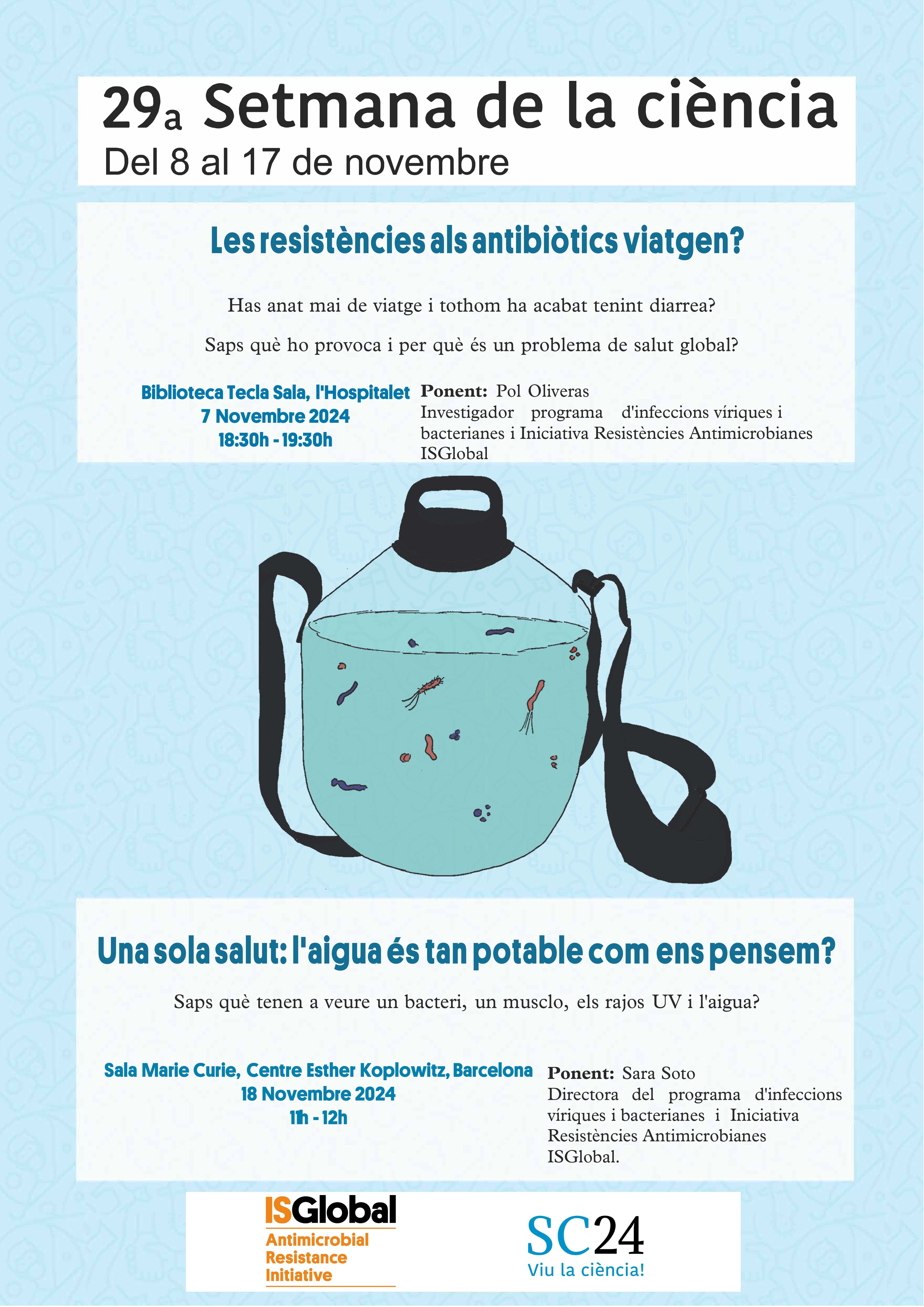 Cartell de l'acte "Les resistències als antibiòtics viatgen?", en el marc de la 29a Setmana de la Ciència
