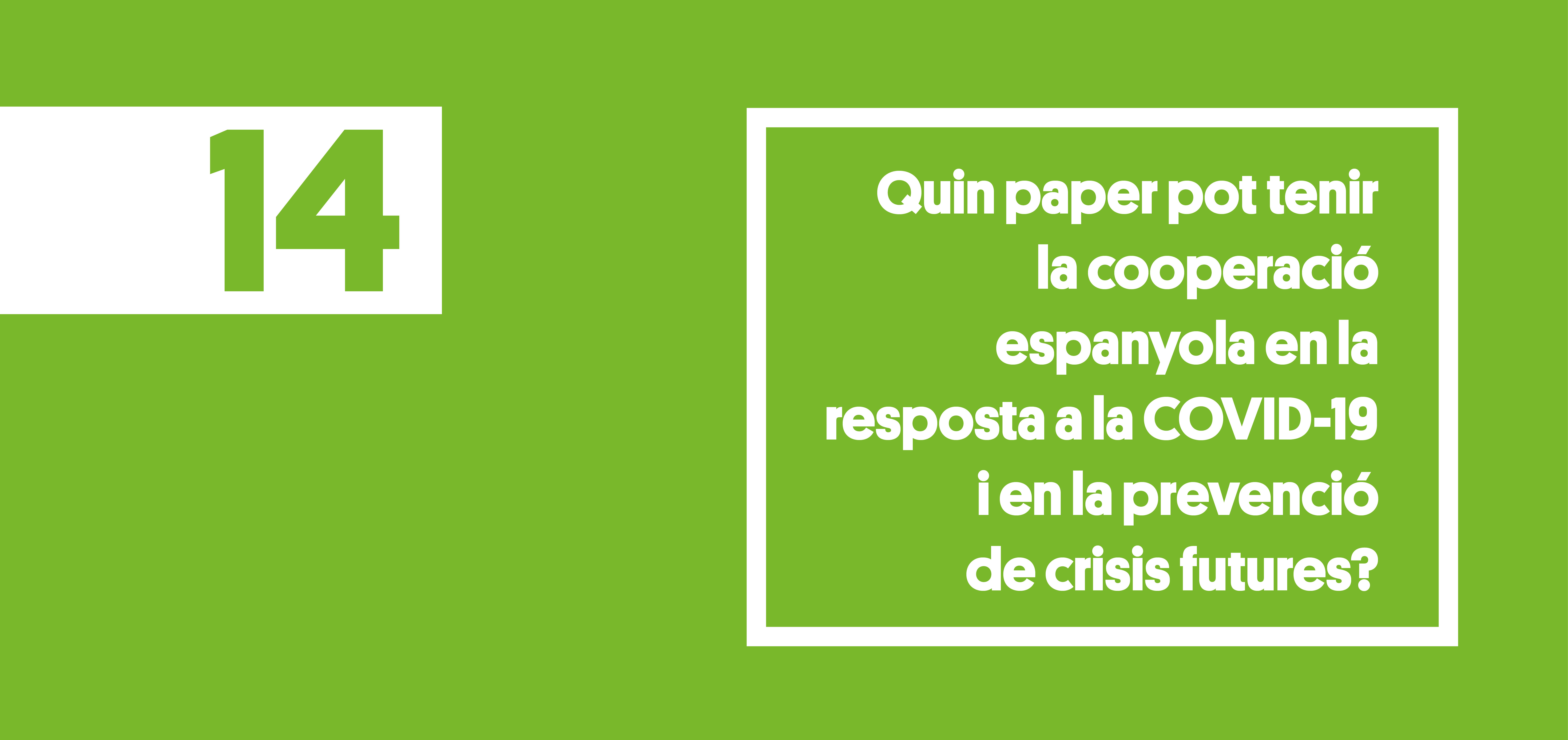 Poques eines seran més útils per a aquest propòsit que la cooperació internacional per al desenvolupament, un mecanisme modest de redistribució global de la riquesa però amb un potencial fabulós per a la innovació, la consolidació de bones practiques i l’alçament d’altres fonts de finançament. En el context de la resposta a la COVID-19 i, molt especialment, de la prevenció de pandèmies futures, les polítiques d’ajut al desenvolupament poden tenir un paper estratègic en la detecció precoç d’amenaces, la generació de respostes ràpides i d’alt impacte, la intervenció concertada d’actors públics i privats, i la dotació pressupostària de tot el procés. Per a això caldrà reconsiderar alguns dels supòsits amb els quals hem treballat fins ara i promoure reformes que adaptin el sistema de cooperació al nou context. Aquesta transformació ja ha començat i de forma accelerada, en el camp de la salut global. Espanya té la capacitat i la responsabilitat de representar un paper rellevant en aquest procés.