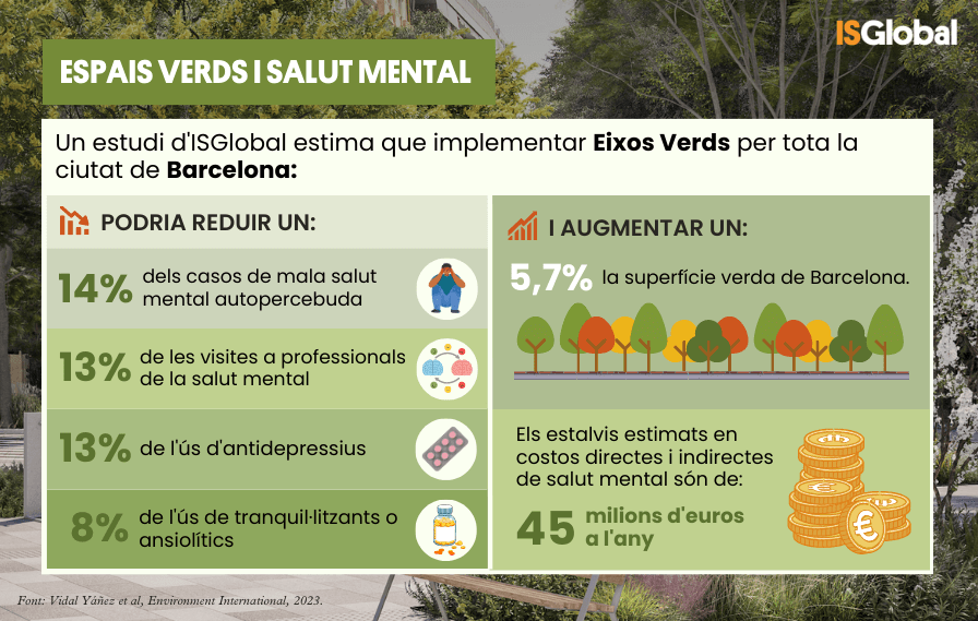 Un estudi d'impacte en salut liderat per l'Institut de Salut Global de Barcelona (ISGlobal), centre impulsat per Fundació ”la Caixa”, ha conclòs que implementar eixos verds al llarg de tota la ciutat de Barcelona reportaria una “reducció considerable” en els problemes de salut mental que suporta la població adulta i en els costos directes i indirectes associats a aquests. La recerca s'ha donat a conèixer en la revista Environment International.