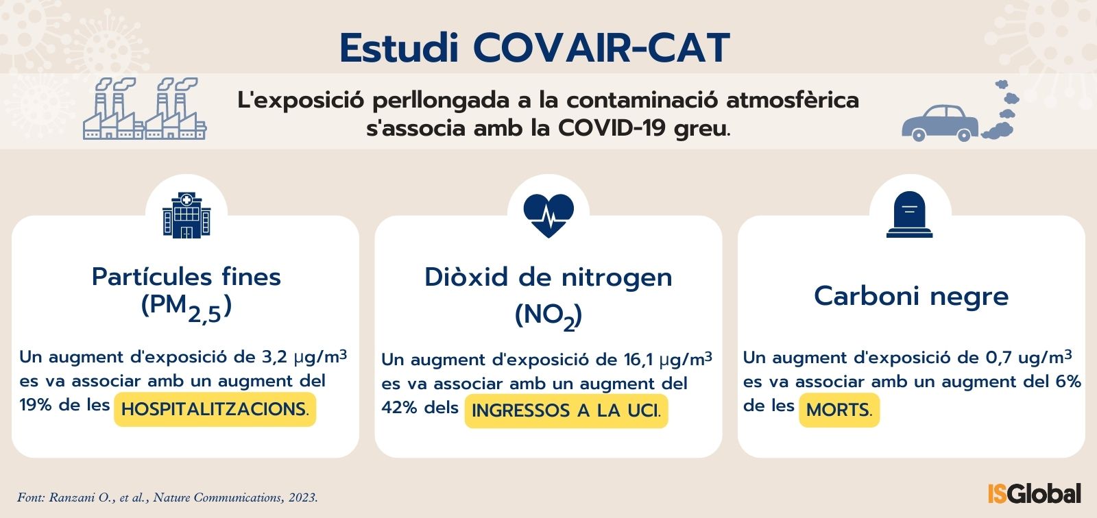Estar exposat a la contaminació atmosfèrica durant un llarg període de temps es relaciona amb un major risc de patir COVID-19 greu, ser hospitalitzat per aquest motiu, ingressar en una unitat de vigilància intensiva (UCI) i morir, segons un estudi liderat per l'Institut de Salut Global de Barcelona (ISGlobal). L'estudi, publicat a la revista Nature Communications, s'ha basat en una gran cohort de 4.660.502 persones adultes que residien a Catalunya el 2020, any en què aquest territori va registrar una alta càrrega de COVID-19.