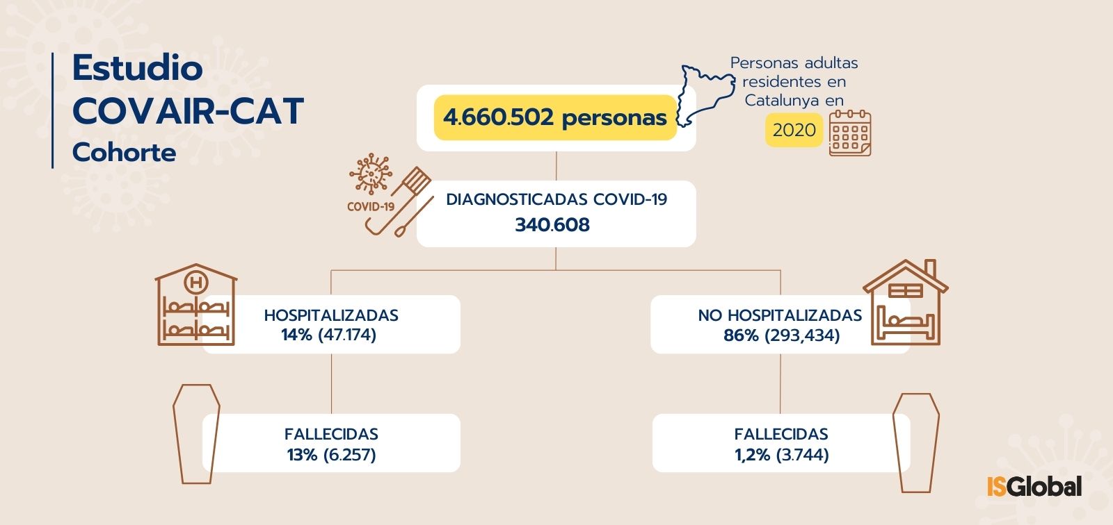 Segons la informació recaptada, 340.608 persones van ser diagnosticades de COVID-19 el 2020 a Catalunya. Un 14% d'elles (47.174) van ser hospitalitzades i un 1,4% (4.699) van ingressar en UCI. Sumant les persones que van morir hospitalitzades amb les quals van morir no hospitalitzades, es van produir un total de 10.001 morts relacionades amb la COVID-19 (3%).