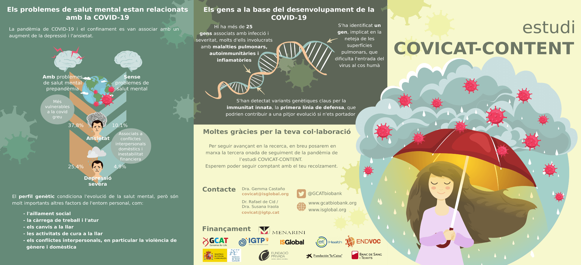 Avui s’inicia l’estudi COVICAT-CONTENT 2023, que té per objecte el seguiment de la COVID-19 a diferents cohorts de Catalunya i de la resta de l’Estat espanyol. Personal investigador de l’Institut de Salut Global de Barcelona (ISGlobal) i del projecte GCAT|Genomes for Life de l’Institut de Recerca Germans Trias i Pujol (IGTP) avaluen els determinants genètics i epidemiològics associats a la malaltia, així com els efectes a llarg termini de la pandèmia en la salut física i mental de les persones i l’evolució de la resposta immunitària. D’aquesta manera, es vol ajudar a definir models predictius i polítiques de control davant de futures situacions similars.
