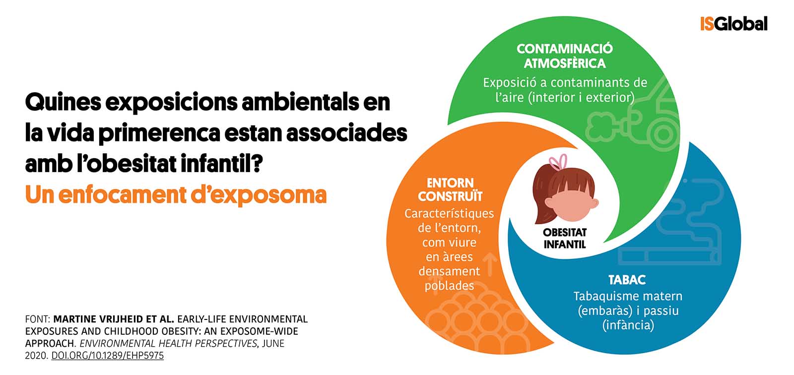 De quina manera influeixen les exposicions ambientals durant l'embaràs i la infància en més risc d'obesitat infantil? L'Institut de Salut Global de Barcelona (ISGlobal), centre impulsat per la Fundació ”la Caixa”, i la Universitat del Sud de Califòrnia han liderat el primer gran estudi que relaciona una multitud de contaminants i factors ambientals –77 exposicions prenatals i 96 postnatals– amb el risc d'obesitat infantil. Els resultats mostren el paper destacat que podrien jugar la contaminació atmosfèrica, el tabac i les característiques de l'entorn construït, com viure en àrees densament poblades, en el desenvolupament d'aquest problema de salut infantil.
