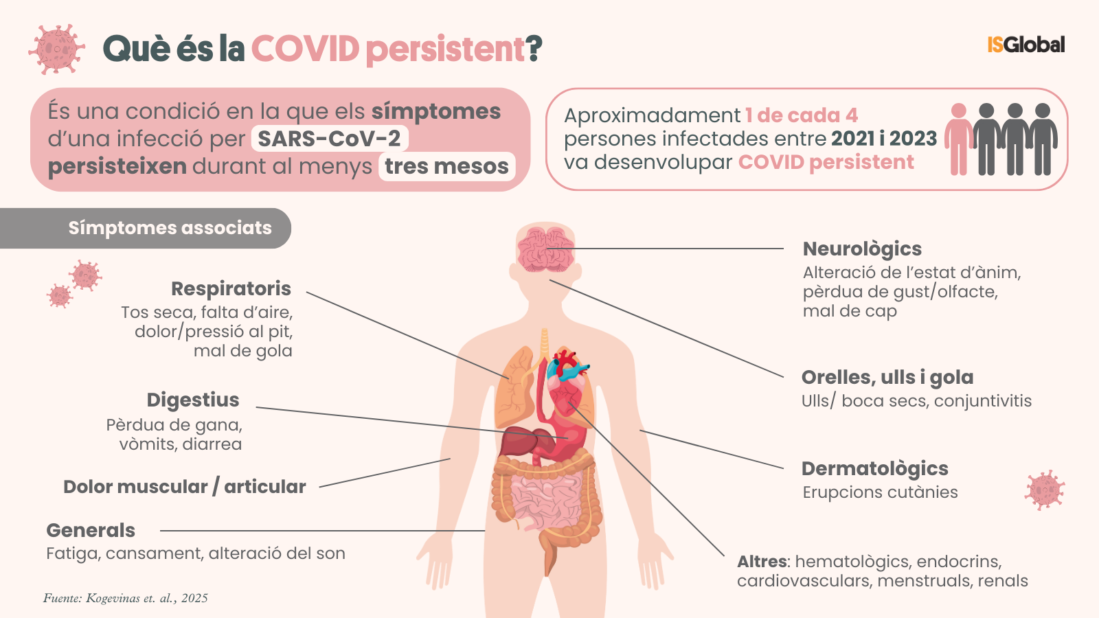Kogevinas, M., Karachaliou, M., Espinosa, A., Iraola-Guzmán, S., Castaño-Vinyals, G., Delgado-Ortiz, L., Farré, X., Blay, N., Pearce, N., Bosch de Basea, M., Alonso Nogués, E., Dobaño, C., Moncunill, G., de Cid, R., & Garcia-Aymerich, J. (març 2025). Risc, determinants i persistència de la COVID persistent en un estudi de cohort poblacional a Catalunya. BMC Medicine. http://doi.org/10.1186/s12916-025-03974-7