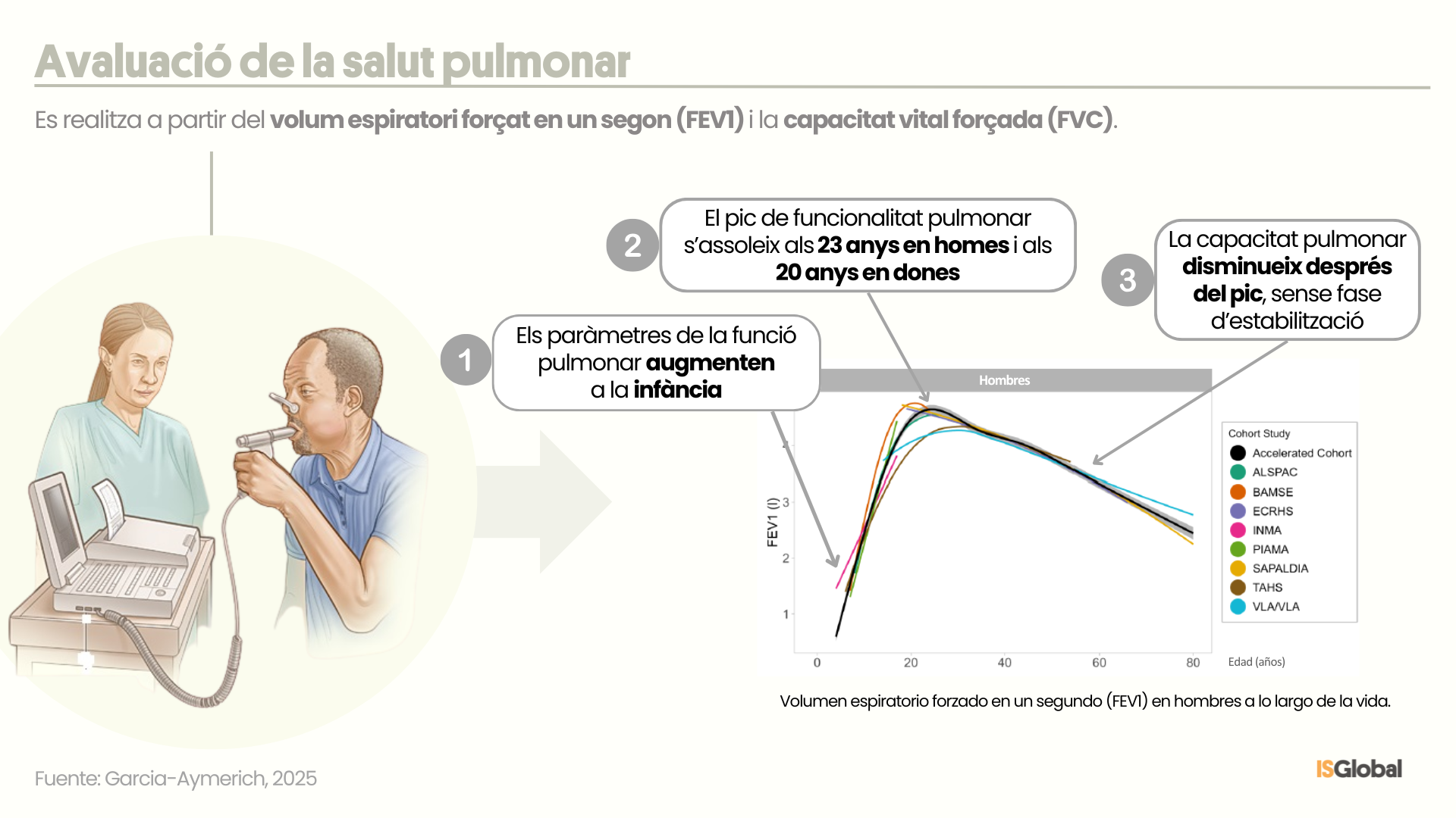 En l’estudi actual, en canvi, s’ha utilitzat un “disseny de cohort accelerada”, és a dir, s’han agrupat dades de múltiples estudis de cohort per cobrir el rang d’edat desitjat. “Vam incloure més de 30.000 persones d’entre 4 i 82 anys procedents de vuit estudis de cohort de la població d’Europa i Austràlia”, explica Judith Garcia-Aymerich, primera autora de l’estudi i codirectora del programa de Medi ambient i salut al llarg de la vida d’ISGlobal. Els paràmetres de funcionalitat i capacitat pulmonar es van avaluar mitjançant espirometria forçada, una prova en què el pacient ha d’expulsar tot l’aire en el menor temps possible després d’una inspiració màxima. A més, es van recollir dades sobre tabaquisme actiu i diagnòstics d’asma.