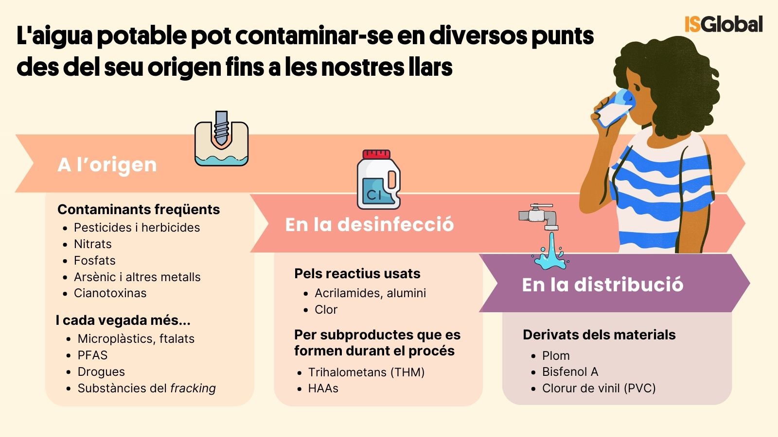 L'aigua és portadora de microbis, la qual cosa ens porta a recordar John Snow, el brot de còlera i les emblemàtiques fonts londinenques que van marcar l'inici de l'epidemiologia. Però encara que la contaminació microbiològica continua sent un problema important en moltes regions empobrides, la principal preocupació de la nostra societat actual és la contaminació química de l'aigua potable derivada de les activitats humanes.