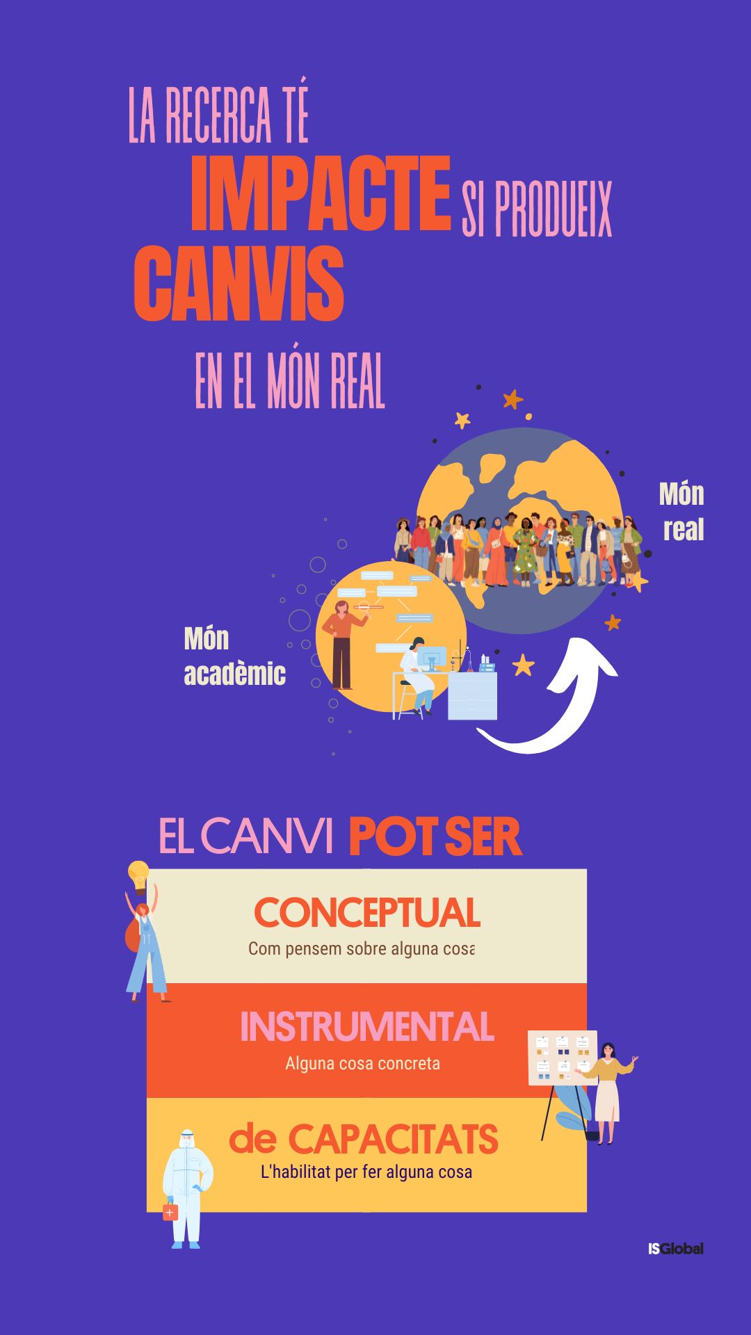 Abans de seguir, unes paraules sobre el que no és l'impacte. Si impacte és igual a canvi, llavors impacte NO és difusió, reputació acadèmica ni cites. També significa que comptar amb 200 persones en una activitat de divulgació o en un curs de capacitació no és impacte per se, sinó un mitjà per aconseguir impacte. El veritable impacte és el canvi resultant d'aquesta activitat, per exemple, si va motivar les i els estudiants a interessar-se més per les carreres STEM (ciència, tecnologia, enginyeria i matemàtiques) o va millorar la capacitat de les persones que van participar en la formació per diagnosticar una malaltia concreta.
