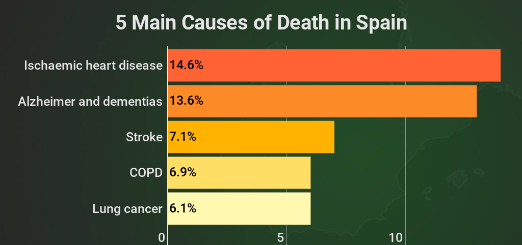 The five main causes of death in Spain are, in descending order, ischaemic heart disease, which accounted for 14.6% of all deaths, Alzheimer disease and other dementias (13.6%), stroke (7.1%), chronic obstructive pulmonary disease (COPD) (6.9%) and lung cancer (5%).