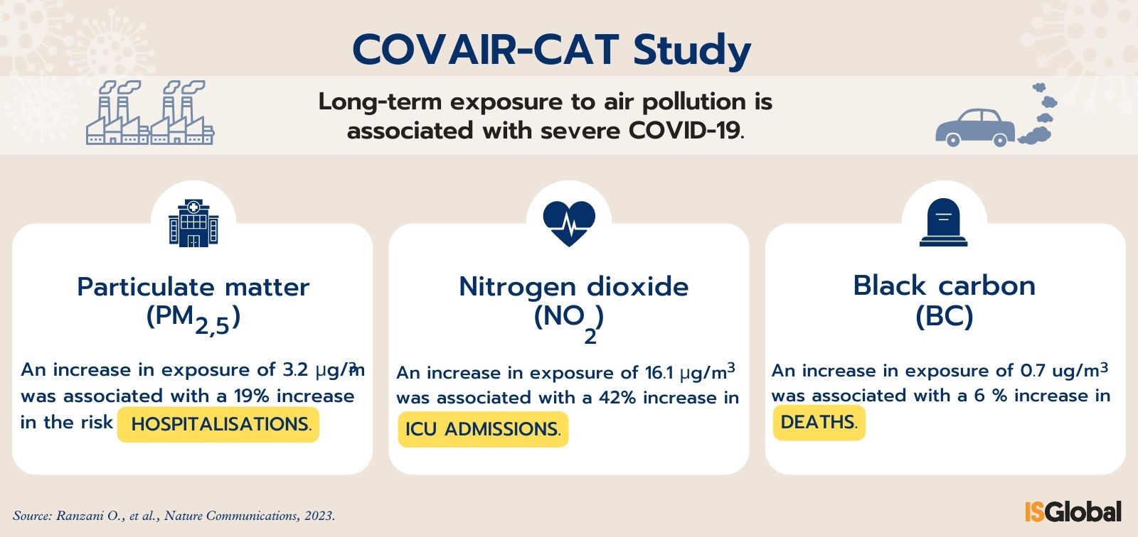 Ranzani O, Alari A, Olmos S, Milà C, Rico A, Ballester J, Basagaña X, Chaccour C, Dadvand P, Duarte-Salles T, Foraster M, Nieuwenhuijsen M, Sunyer J, Valentín A, Kogevinas M, Lazcano U, Avellaneda-Gómez C, Vivanco R, Tonne C. Long-term exposure to air pollution and severe COVID-19 in Catalonia: a population-based cohort study, Nature Communications. DOI: 10.1038/s41467-023-38469-7