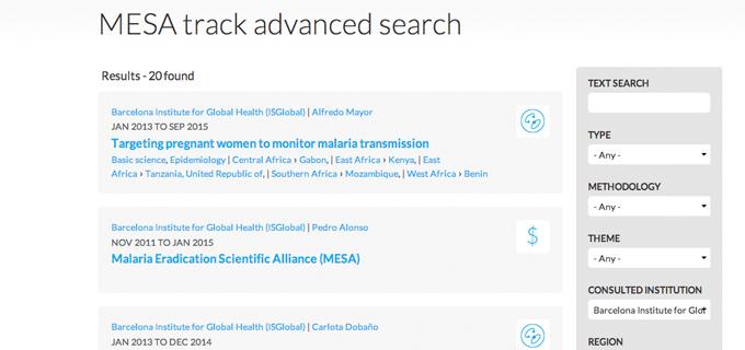 The "MESA Track" tool is a user-friendly, open database, which captures projects relevant to the malaria elimination and eradication agenda. Users can search for projects in various fields and discover what the scientific community is doing.