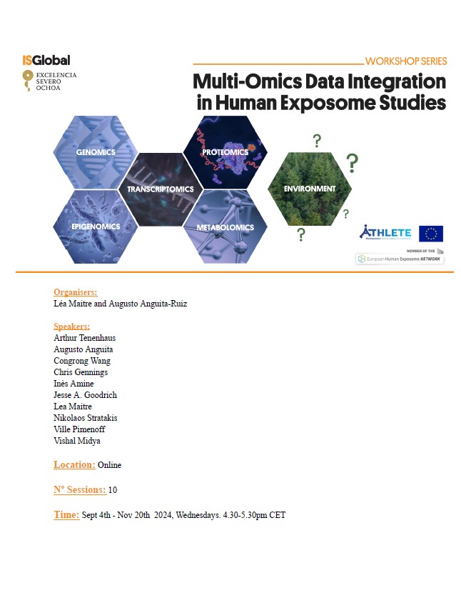 This workshop is aimed at Master/PhD students, researchers, clinicians, and other professionals working in the fields of exposomics, epidemiology, or toxicology with an interest in understanding how omics data, including the exposome, can be integrated in epidemiological research.