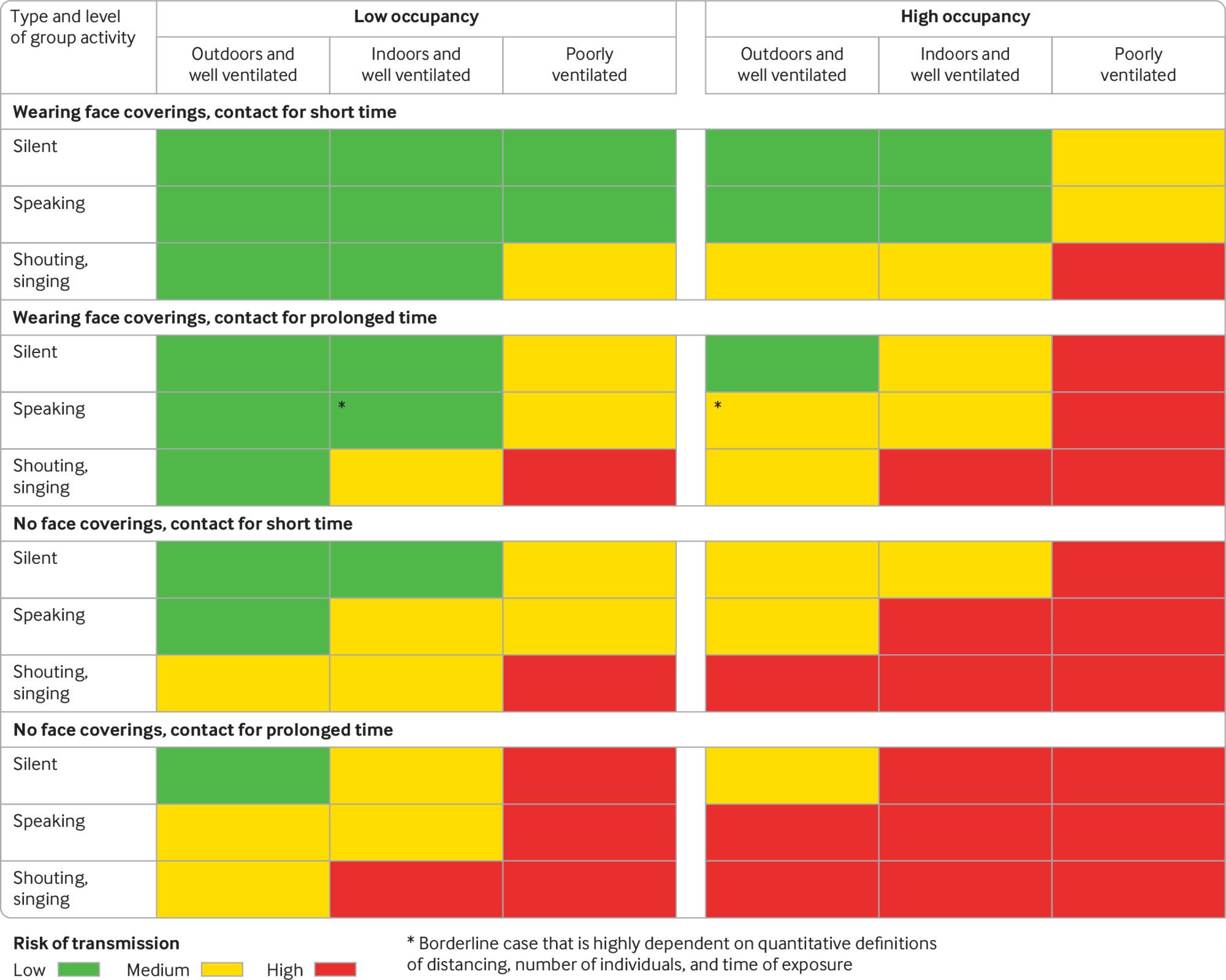 The risk of transmission goes beyond the simple safety distance rule – it also depends on other factors such as air flow, viral load, and contact duration with other people. A table incorporating all these factors allows to better evaluate the risk of transmission in different settings and activities.
