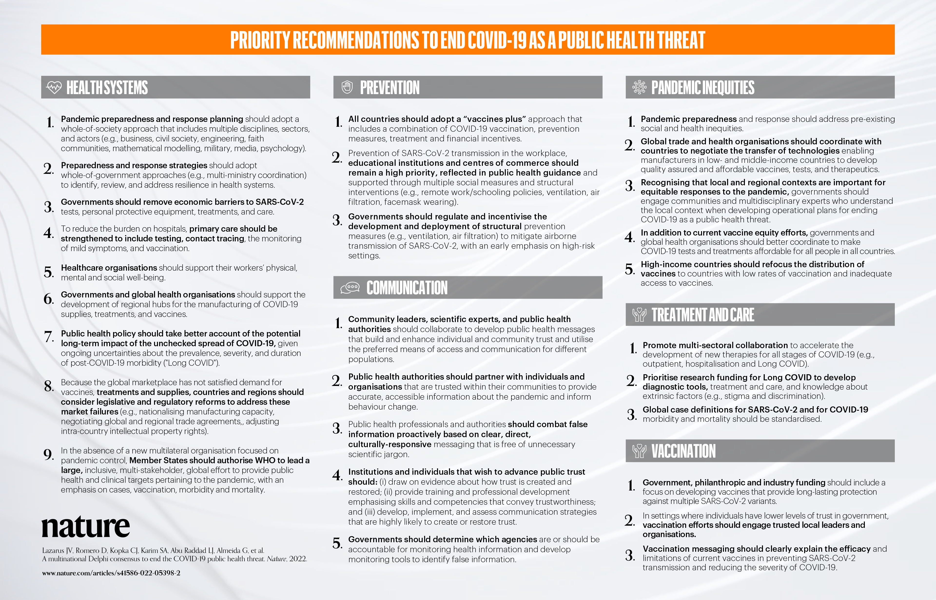 The priority recommendations set forth by the Nature COVID-19 Consensus Panel (Nov 2022).