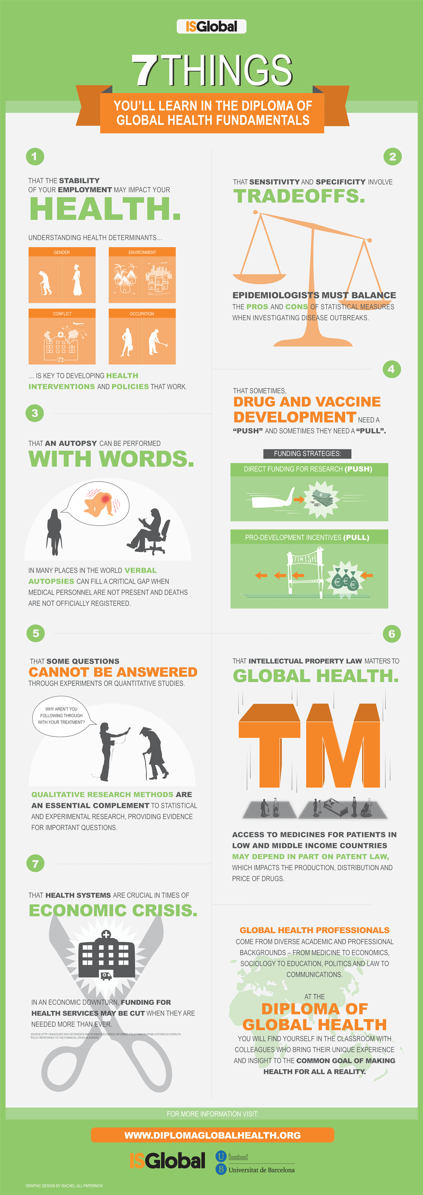 The following infographic shows 7 of the topics that are dealt with in more depth during the ISGlobal-University of Barcelona Diploma of Global Health Fundamentals.