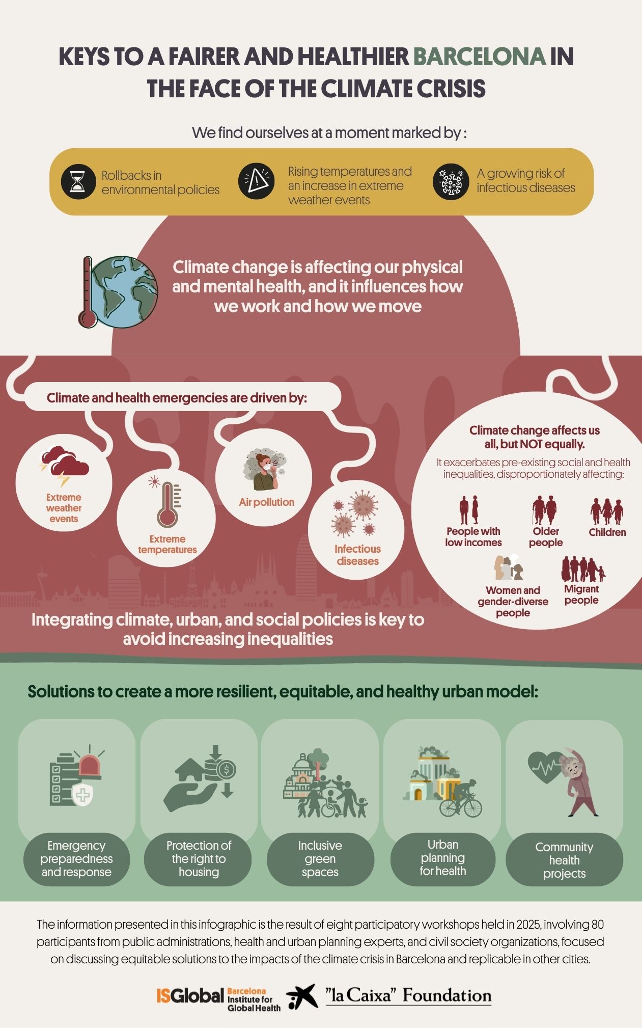 To address these challenges, during the second half of 2025, 80 people met in eight thematic workshops at the Palau Macaya in Barcelona. The project Voices for Health: narratives and action against climate change from “La Caixa” Foundation with the scientific direction of ISGlobal, promoted spaces for reflection and dialogue on political, urban, social, and public health solutions to climate change.