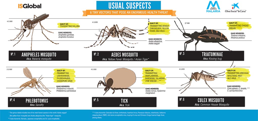 Seventh infographic that summarizes and closes the series "Usual Suspects: 6 Tiny Vectors That Represent a Huge Thret to Our Health": Anopheles mosquito, Aedes mosquito, Culex mosquito, Triatomine bug, Phlebotomine sand fly and Tick.