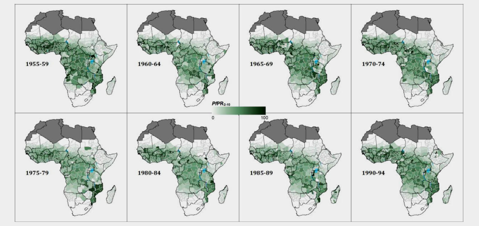 Previous global initiatives have had minor impacts on malaria transmission, and a historically unprecedented decline has been observed since 2000. However, there has been little change in the high transmission belt that covers large parts of West and Central Africa. Previous efforts to model the changing patterns of P. falciparum transmission intensity in Africa have been limited to the past 15 years or have used maps drawn from historical expert opinions.
