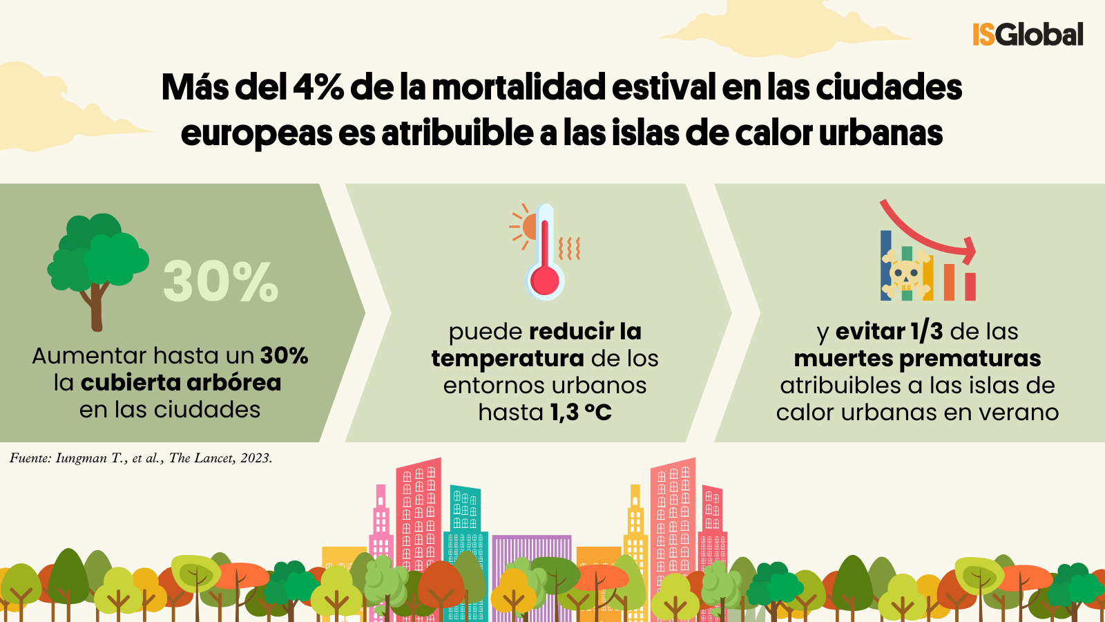 Más del cuatro por ciento de las muertes que se producen en las ciudades durante los meses de verano se deben a las islas de calor urbanas, y un tercio de estas muertes podrían evitarse alcanzando una cobertura arbórea del 30%, según un estudio de modelización publicado en The Lancet y liderado por el Instituto de Salud Global de Barcelona (ISGlobal), centro impulsado por la Fundación "la Caixa". Los resultados del estudio, obtenidos con datos de 93 ciudades europeas, enfatizan los sustanciales beneficios de plantar más árboles en las ciudades para atenuar el impacto del cambio climático.