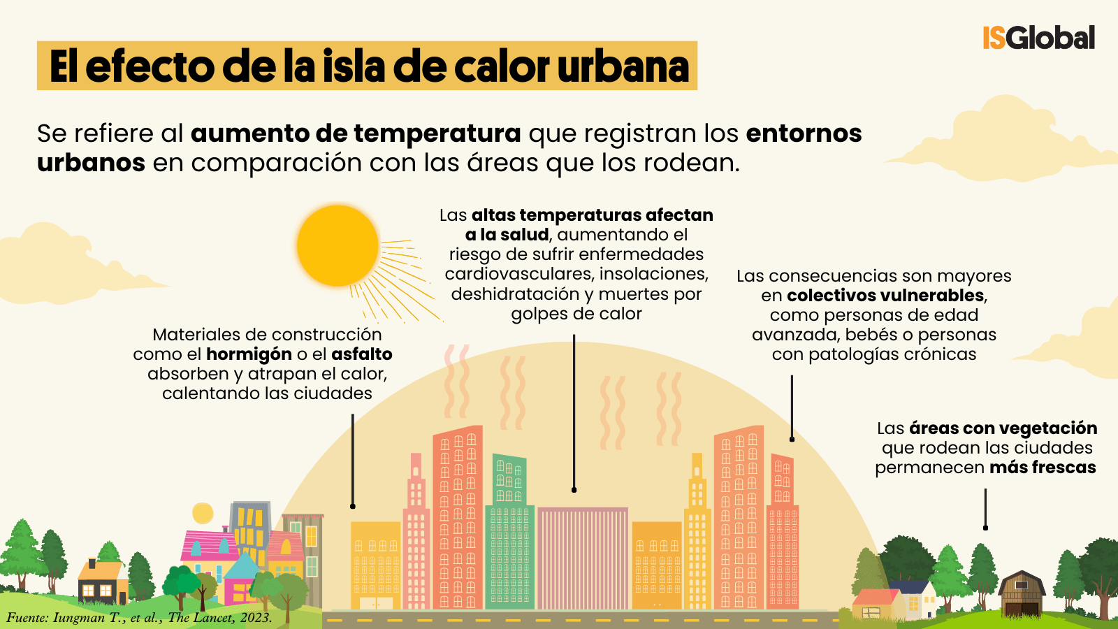 La exposición al calor se ha asociado con mortalidad prematura, enfermedades cardiorrespiratorias e ingresos hospitalarios. Esto es particularmente cierto con las olas de calor, pero también ocurre con temperaturas moderadamente altas en verano. Las ciudades son especialmente vulnerables a las altas temperaturas. La menor vegetación, la mayor densidad de población y las superficies impermeables de edificios y calles, incluido el asfalto, provocan una diferencia de temperatura entre la ciudad y las zonas circundantes, un fenómeno denominado isla de calor urbana. En vista del calentamiento global y el crecimiento urbano, se prevé que este efecto empeore en las próximas décadas.