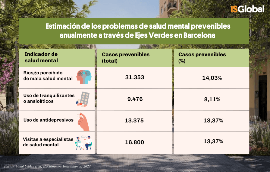 Un estudio de impacto en salud liderado por el Instituto de Salud Global de Barcelona (ISGlobal), centro impulsado por Fundación ”la Caixa”, ha concluido que implementar ejes verdes a lo largo de toda la ciudad de Barcelona reportaría una “reducción considerable” en los problemas de salud mental que soporta la población adulta y en los costes directos e indirectos asociados a los mismos. La investigación se ha dado a conocer en la revista Environment International.