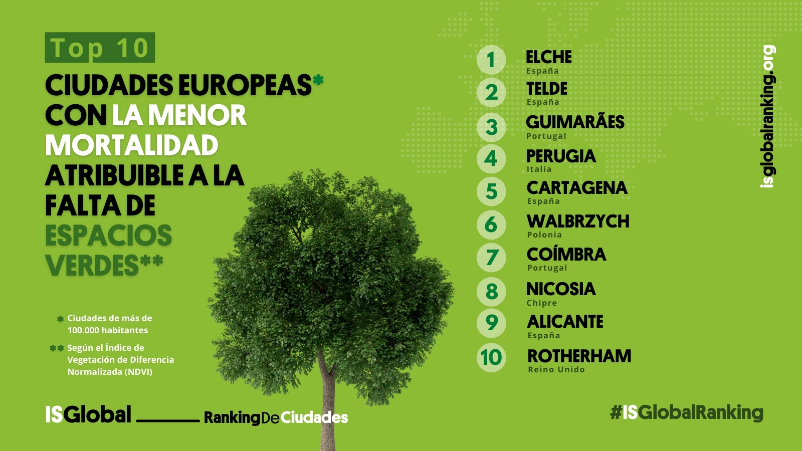 Ciudades de más de 100.000 habitantes con menor carga de mortalidad atribuible a un menor índice de Vegetación de Diferencia Normalizada (NDVI).