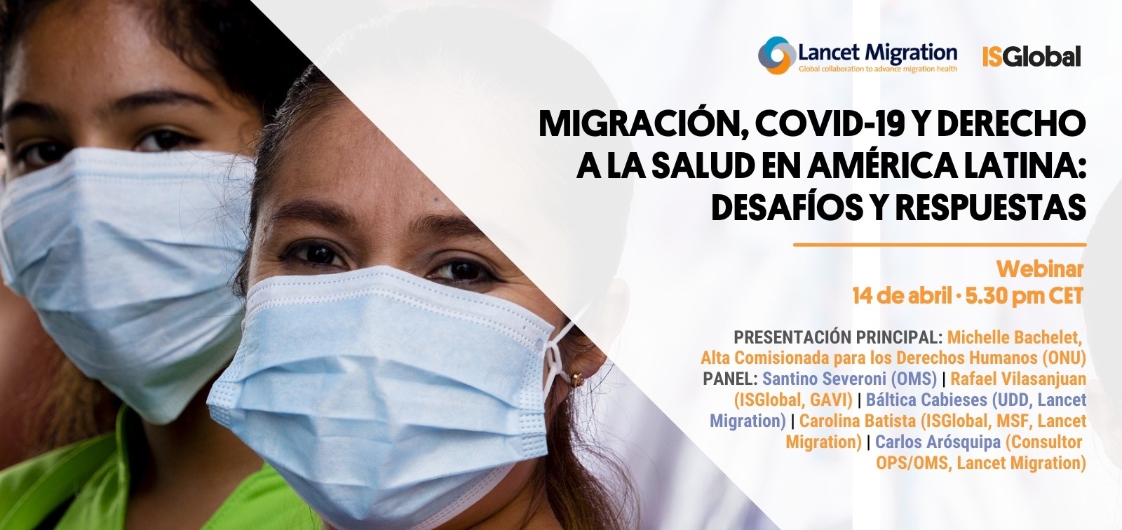 - Presentación principal: Michelle Bachelet, Alta Comisionada para los Derechos Humanos (ONU) | Panel: María Andrea Godoy (Viceministra Protección Social, Ministerio Salud y Protección Social, Colombia) · Maritza Ortiz (Ministerio Salud, Perú) · Santino Severoni (OMS) · Rafael Vilasanjuan (ISGlobal, GAVI) · Adrián Bonilla (EU-LAC) · Báltica Cabieses (UDD, Lancet Migration) · Carolina Batista (ISGlobal, MSF, Lancet Migration) · Carlos Arósquipa (Consultor OPS/OMS, Lancet Migration)