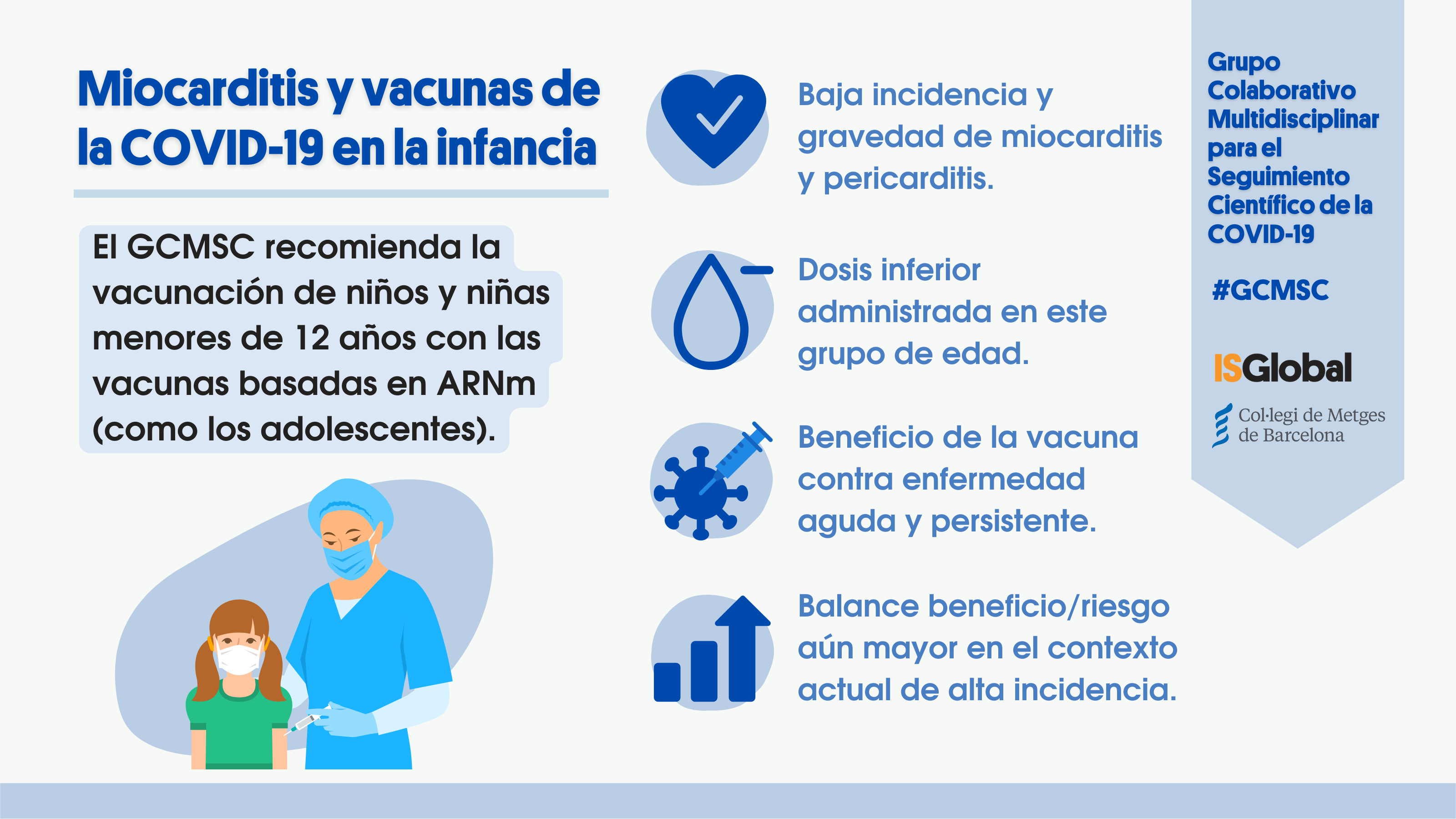 Tras realizar un análisis exhaustivo de la evidencia científica publicada hasta la fecha, el grupo de expertas y expertos ha valorado la baja incidencia de miocarditis y/o pericarditis asociada a las vacunaciones en niños y niñas de menos de 12 años (la incidencia acumulada se ha estimado en un máximo de 5 casos/1.000.000 niños vacunados), la aparente baja gravedad de los casos cuando ocurren, la dosis proporcionalmente inferior para este grupo de edad (una tercera parte de la que se administra en adolescentes o adultos) y el beneficio de las vacunas para prevenir la enfermedad aguda, la persistente y las consecuencias más graves de la COVID-19 en pediatría, como el síndrome inflamatorio multisistémico en niños (MIS-C, por sus siglas en inglés).