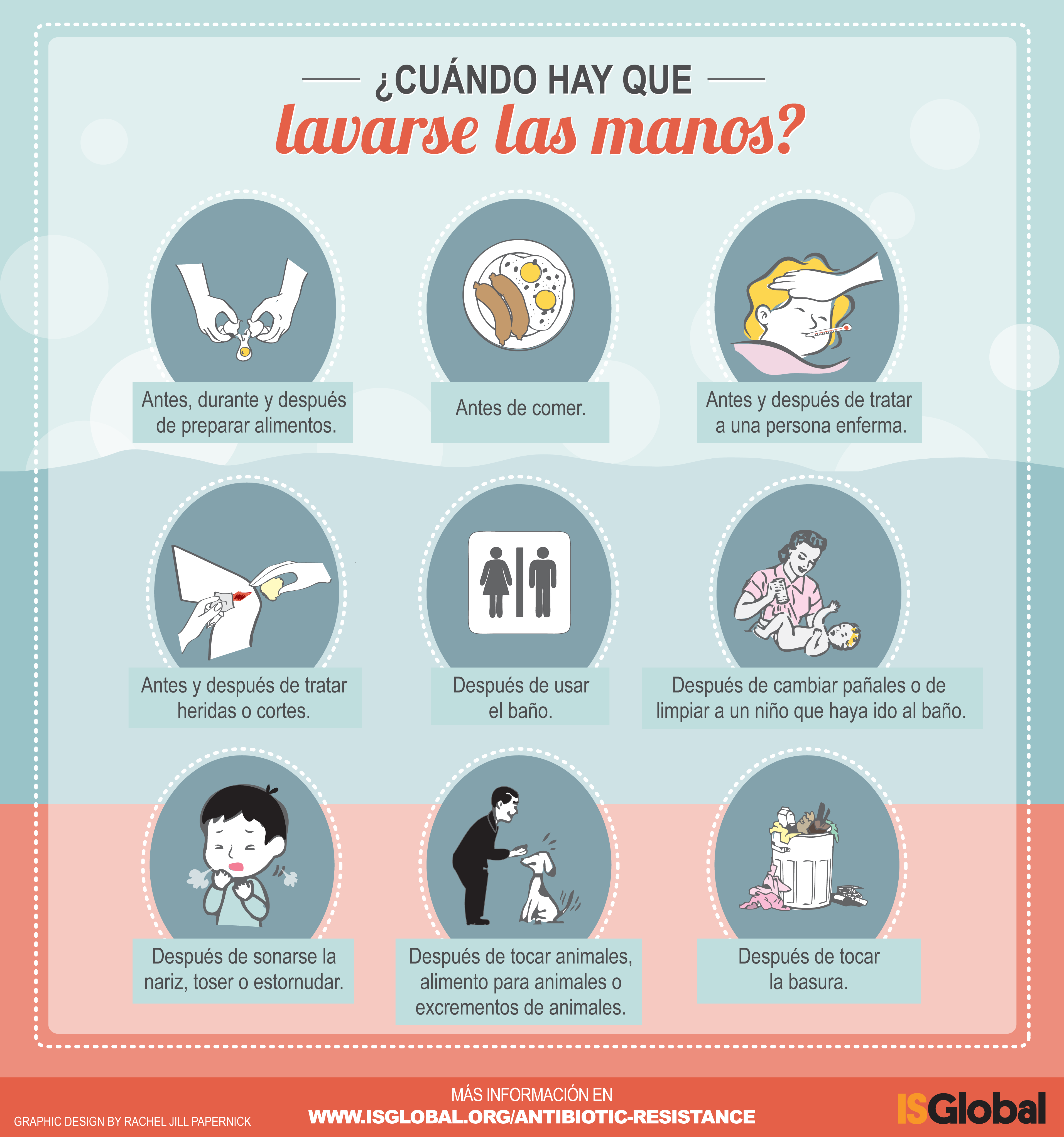Con estas acciones habituales a las que podemos adaptarnos sin problemas, podemos evitar la transmisión de las bacterias y, con ello, el desarrollo de infecciones y la necesidad de usar antibióticos para combatirlasPero ¿qué mejor acción para eludir la problemática asociada con los antibióticos que sortear las infecciones bacterianas? Existen muchas maneras de evitar estas enfermedades con acciones habituales, que quizás no todos conozcamos, pero sólo depende de nosotros llevarlas a cabo. Para empezar, nada tan fácil como lavarse las manos. Muchas instituciones públicas han hecho difusión de la importancia de esta acción, especialmente dirigiéndose a personal hospitalario, como la que realizó el Hospital Clínic de Barcelona a mediados del año pasado con motivo del Día Mundial de la Higiene de Manos. Pero ¡ojo!, no vale lavárselas de cualquier manera; existen protocolos específicos con su correspondiente justificación científica sobre cómo hacerlo debidamente, descritos nada más y nada menos que por el Centro para el Control y la Prevención de Enfermedades.