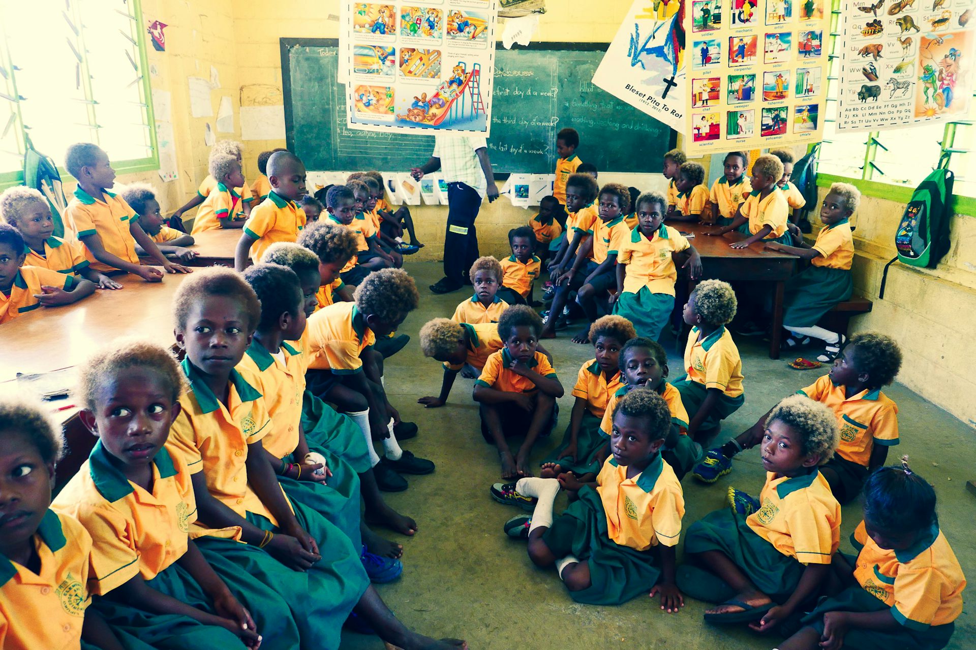 El pian y otras enfermedades ulcerativas afectan sobre todo a niños de entre 5 y 15 años, que se infectan unos a otros por contacto físico al jugar y compartir pupitre. Por eso nuestra primera parada siempre son los colegios: hablamos con los profesores y les pedimos permiso para interrumpir las clases un rato. Solicito a los niños que levanten la mano si tienen alguna herida y los revisamos a todos uno por uno, brazos y piernas. En un aula de 20 alumnos es fácil encontrar 7 u 8 casos, a veces más.