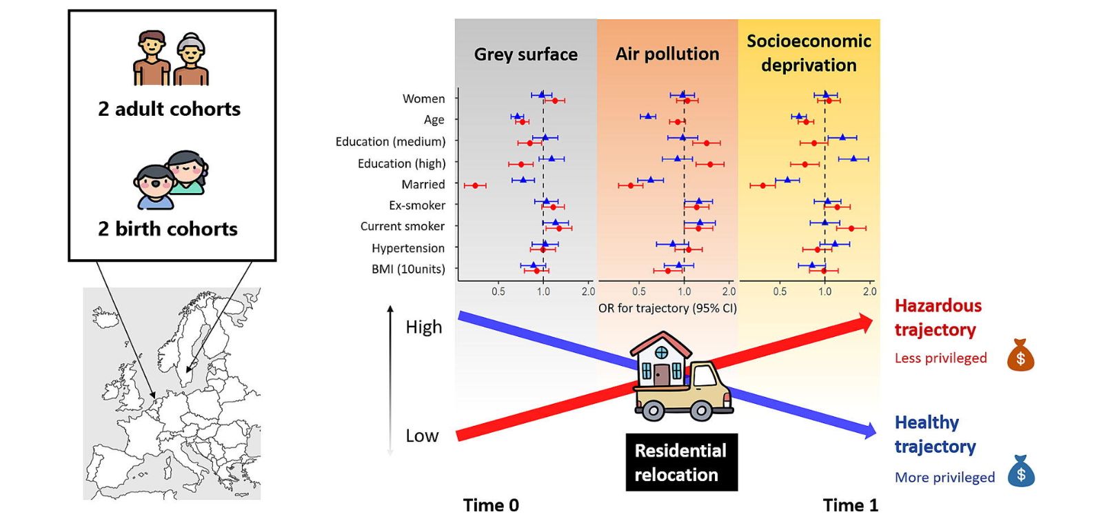 Gráfico extraído del estudio Effect of residential relocation on environmental exposures in European cohorts: An exposome-wide approach, publicado en Environment International en 2023.