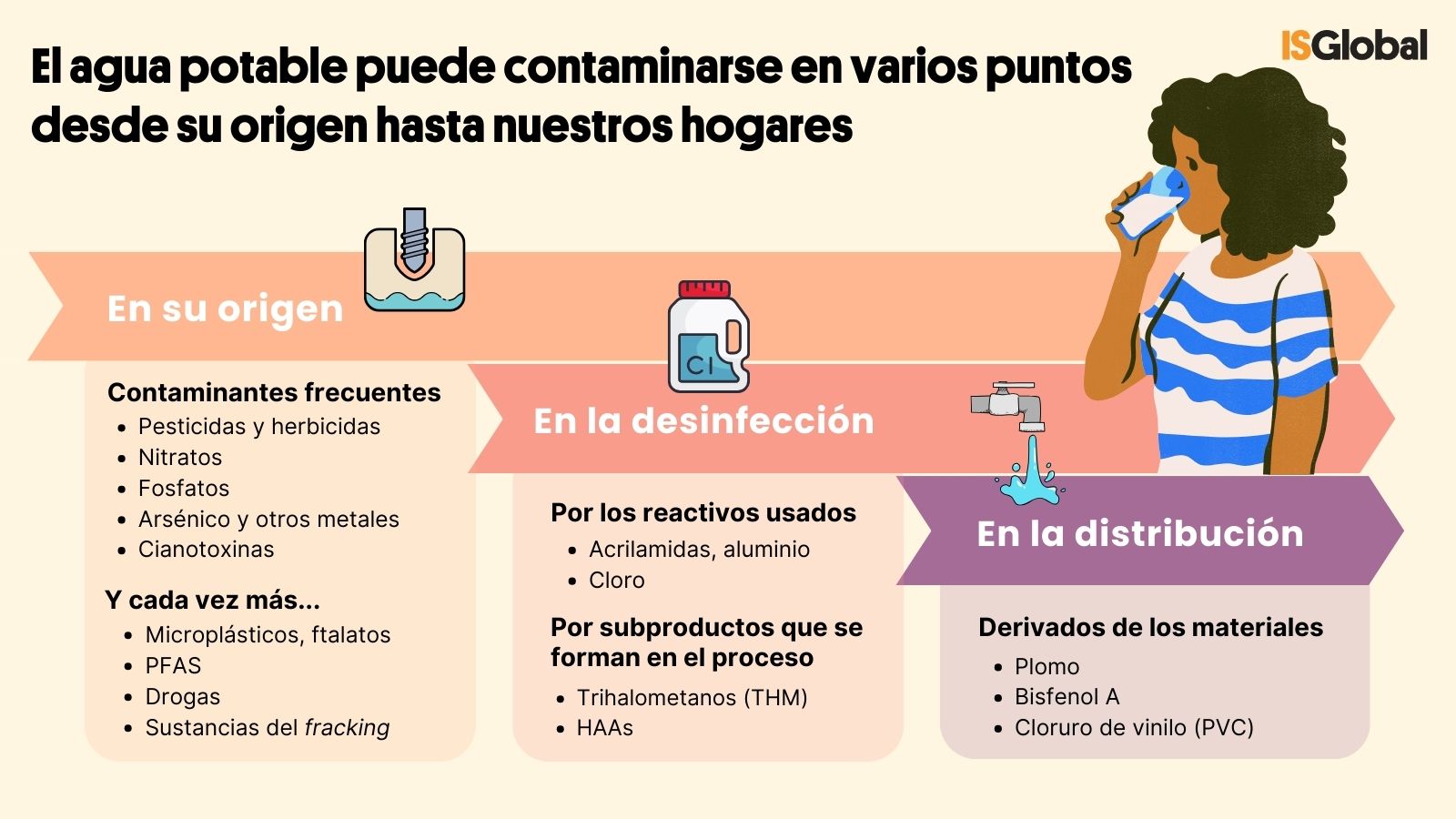 El tratamiento del agua suele reducir los niveles de muchos contaminantes en el agua de origen. Sin embargo, durante el tratamiento de desinfección del agua pueden crearse nuevos contaminantes, y los materiales utilizados en las tuberías de distribución también pueden contribuir a la contaminación. Incluso en países con una normativa establecida sobre el agua potable, muchas de estas sustancias químicas siguen causando problemas de salud.