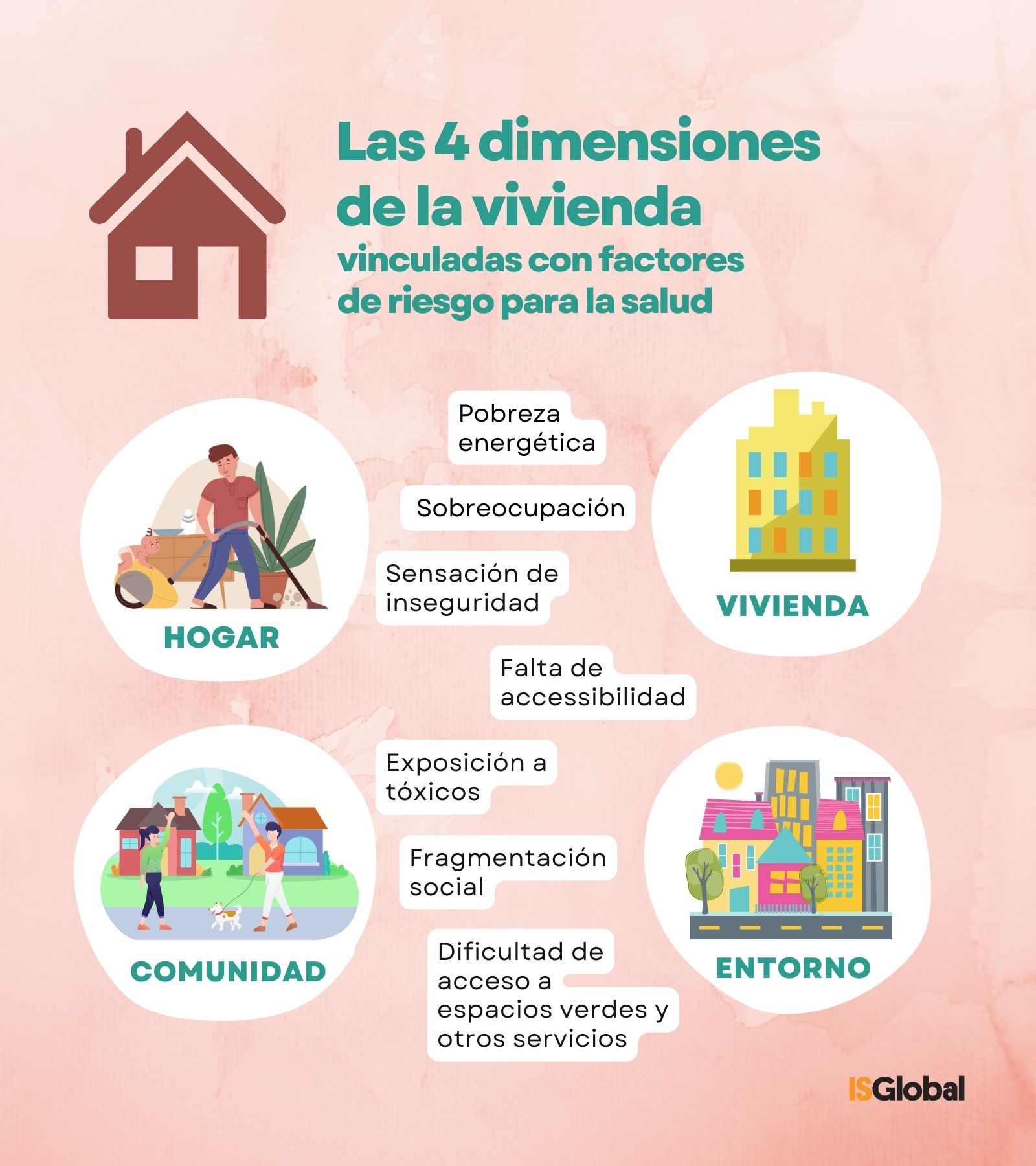Vemos, pues, que existen múltiples dimensiones de la vivienda a considerar en su vínculo con la salud, que la Organización Mundial de la Salud (OMS) resume en cuatro: el hogar, la vivienda física, el entorno inmediato y la comunidad. Abordar desde las políticas públicas los múltiples factores de riesgo asociados a estas cuatro dimensiones implica a distintos sectores con muy diversas competencias. De ahí que requiera una aproximación transversal, basada en criterios derivados de la mejor evidencia científica disponible.