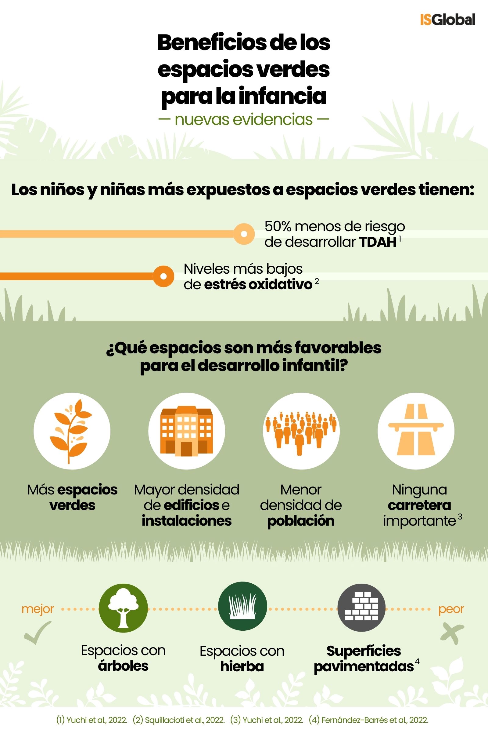 El estudio señalaba que los espacios verdes se relacionan con una mejor atención y memoria en la primera niñez, con mejores resultados académicos y con menos problemas emocionales y de comportamiento. El equipo de investigación resaltaba que todos los espacios verdes parecen favorecer la salud, pero las zonas pobladas de árboles podrían mitigar más la contaminación atmosférica, el ruido y el calor que los espacios verdes más abiertos, y también ayudar mejor a restablecerse de la fatiga mental y a dirigir la atención. Por su parte, las extensiones de césped podrían favorecer más las actividades de grupo y, por lo tanto, el bienestar social. Las superficies pavimentadas expondrían más al calor y a la contaminación atmosférica y acústica relacionada con el tráfico.